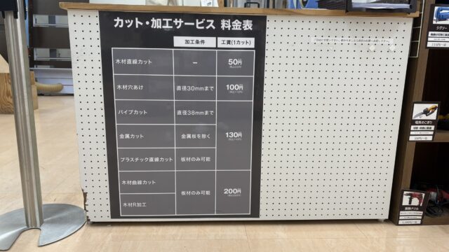 木材のカットは、ホームセンターだと有料のカットサービスを実施しているところが多いです。