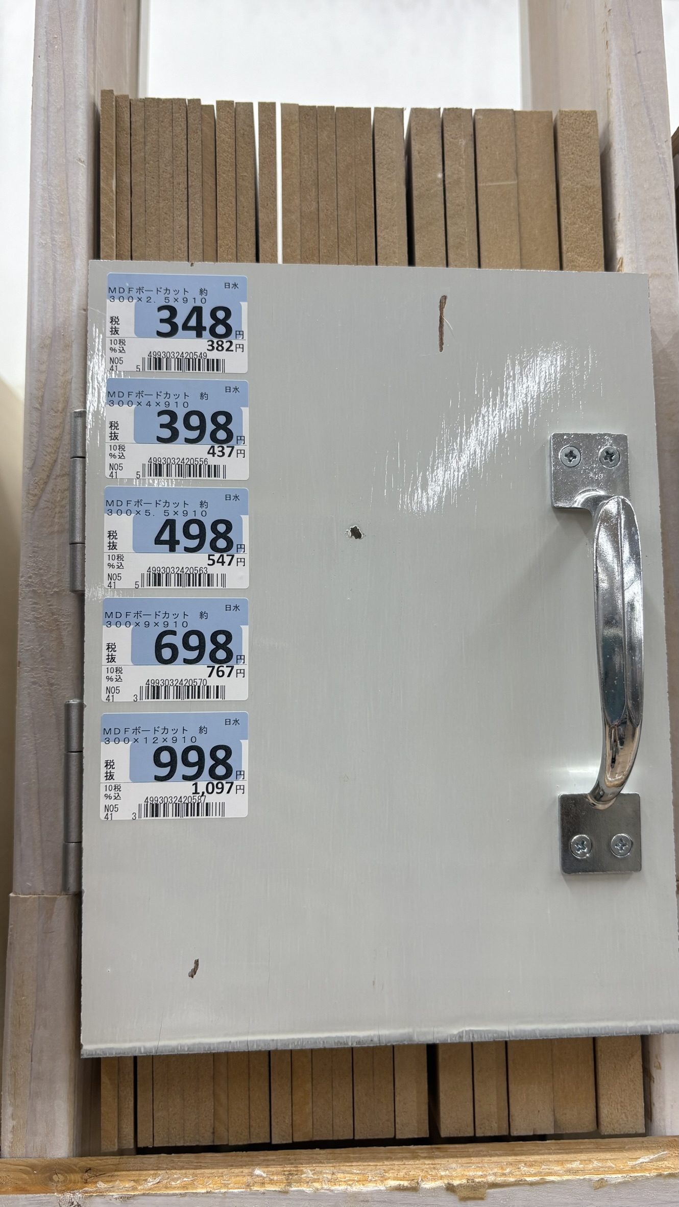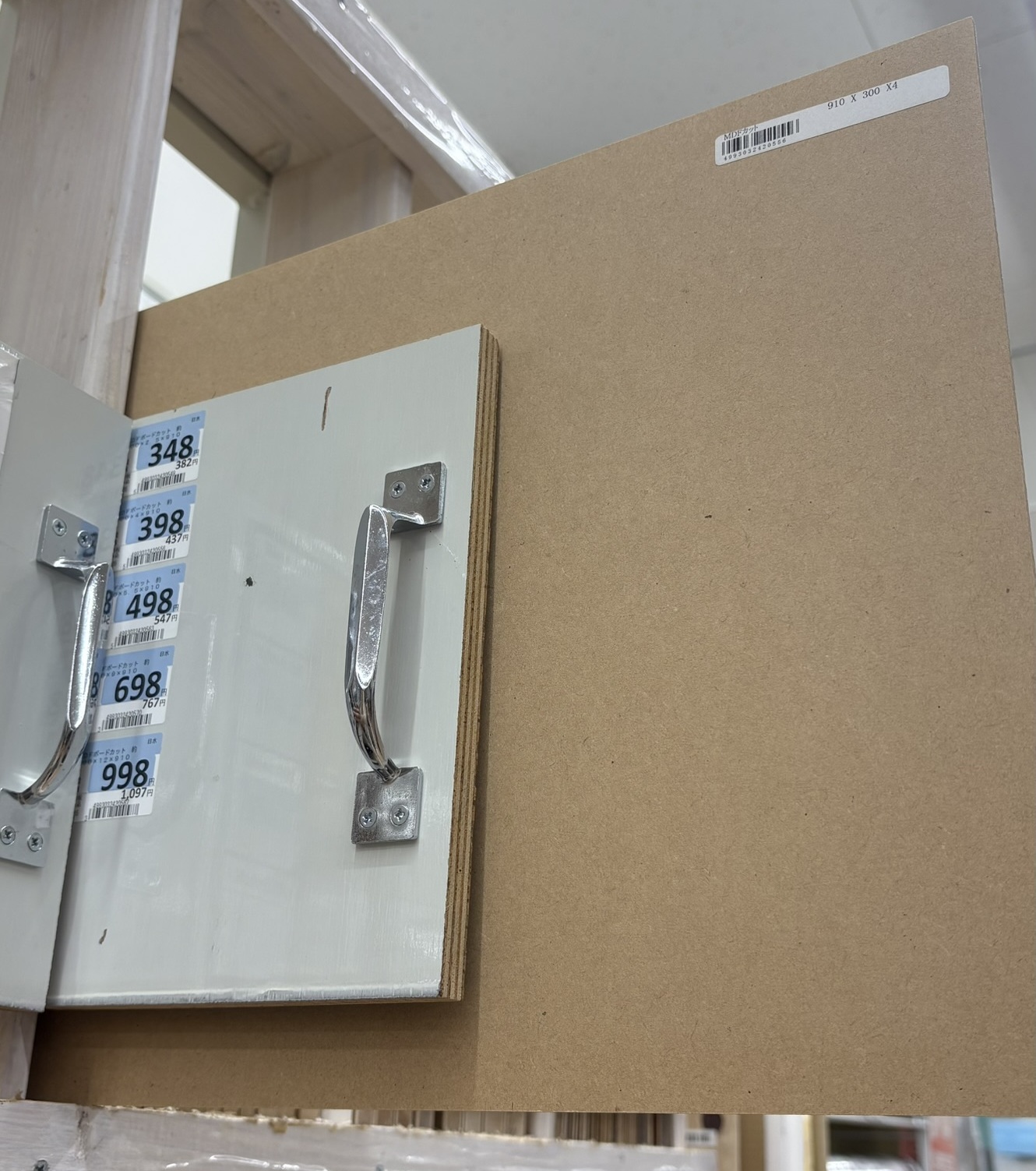 天板の切り出しはお店でやってもらえますが、穴のくり抜きはやってくれないため、自分で加工しやすい MDF板 を使用します。